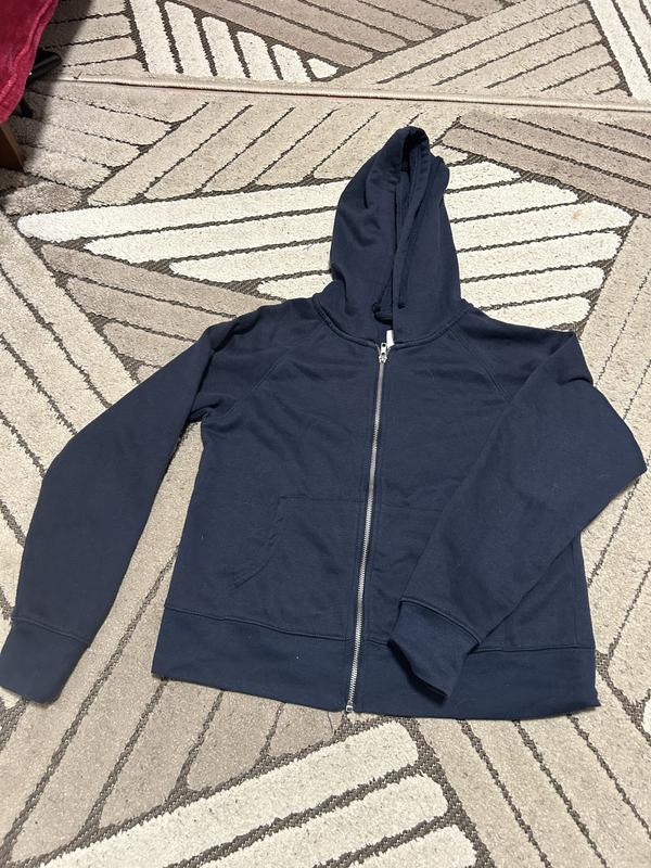 темно синій худі на змійці та флісі довжина 51 довжина рукава від плеча 65 напів обхват талії та грудей 45 є поодинокі катишки