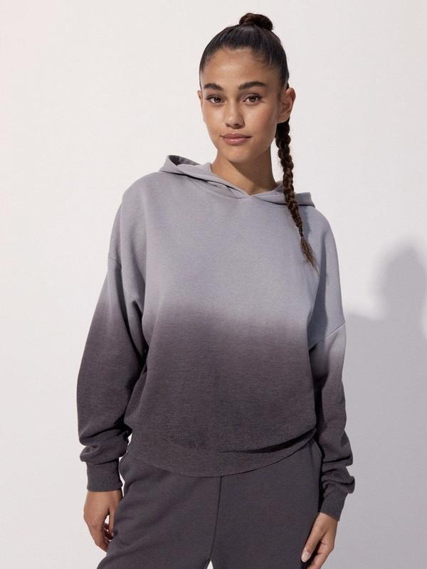 Худі від французького бренду Undiz. Утеплена модель вільного крою. Плечі приспущені. Тканина м'яка і приємна на дотик, тягнеться. (13215) Розмір: XS Напівобхват грудей: 50 см, тягнеться до 60 см Напівобхват талії: 45 см, тягнеться до 55 см Напівобхват стегон: 34 см, тягнеться до 48 см Ширина пройми: 24 см Ширина плечей: 60 см Довжина рукава від горловини: 70 см Довжина виробу: 54 см Склад: 57% бавовна, 43% поліестер