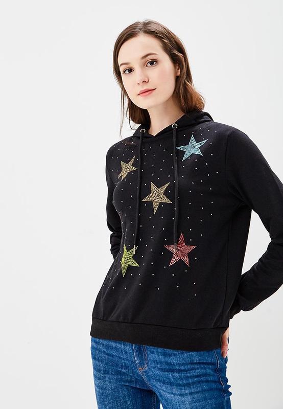 Розмір на етикетці S (на наш 44-46) - дуже вільний Довжина: 60 см Довжина рукава: 60 см Ширина 50см пахви 48 см низ Колір: чорний, на фото виглядає як і реально Зірки -кольори - жовтий, пісочний, червоний, кораловий Тканина двунітка - до тіла більше бавовни, верх поліестр (не мнеться, насичений чорний колір не буде выстирываться)