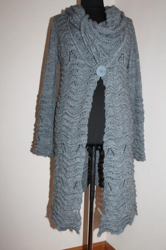 Класна річ італійського виробництва надіслана з Іспанії, розмір Л вказано.60%-вовна alpaca.Довжина-100см, плечі-46см, рукав від плеча-69см пог-56см, воротнік можна по-різному складати.