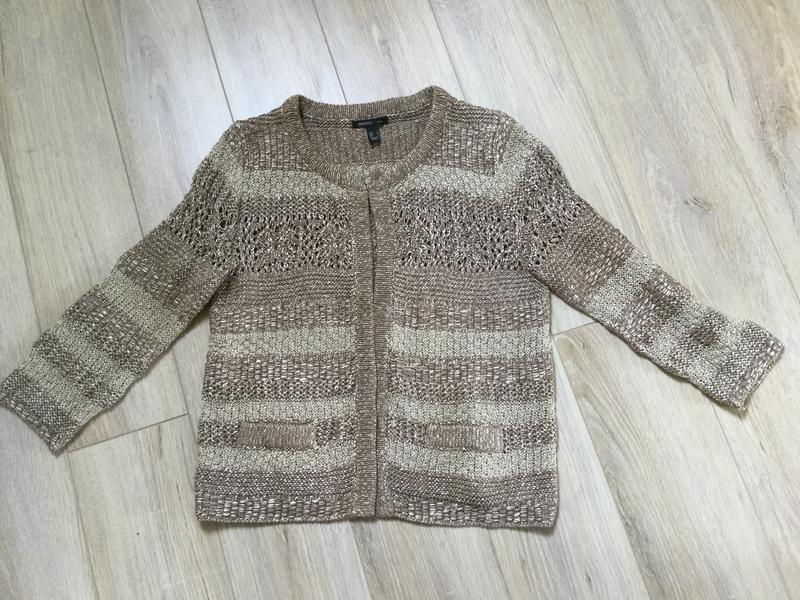 У ідеальному стані , без слідів носіння Гарна комбінація кольорів беж і капучіно з люрексовою ниткою ( на фото не дуже видно , але у реальності виглядає дуже гарно ) Довжина 55 , пог 45 Застібається на гачок Рукава 3/4 Етикетка зі складом зрізана , але , думаю , котон і коліестер