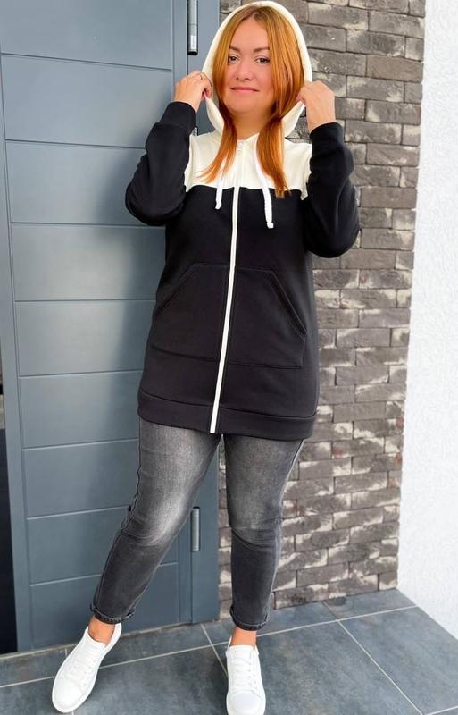 Тканина: тринитка на флісі Колір: чорний, оливка, мокко Розмір: 48-50, 52-54, 56-58 Кардиган з капюшоном та двома кишенями, застібається на блискавку