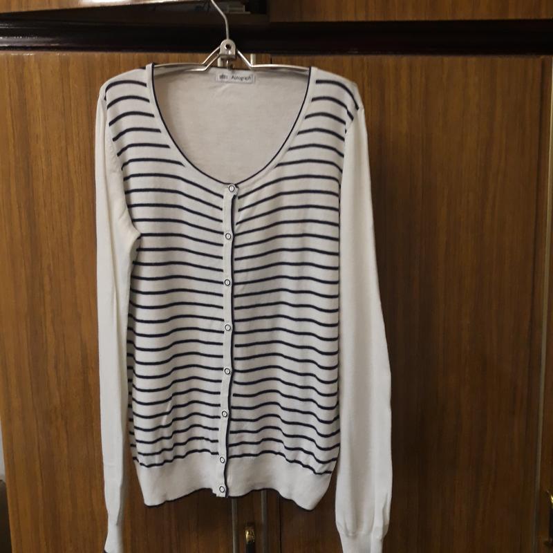 Кардиган в синю полоску змішаного складу, тоненький довжина 58 см, объем груди в свободном состоянии 48 см довжина рукава 65 см, плечи 38 см