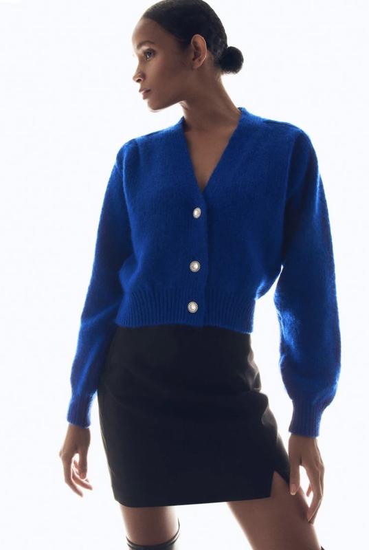 Укороченный кардиган из мягкого и приятного на ощупь трикотажа. V-образный вырез длинные рукава эффектная застежка на пуговицы кайма резинкой в рубчик