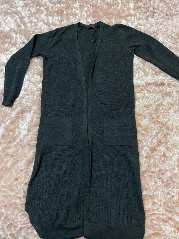 Довгий кардиган, приємний до тіла. Акрил. Має дві кишеньки. Без застібки. Вказаний розмір Л, але йде на М. Є трішки катишек на рукавах, але не багато.