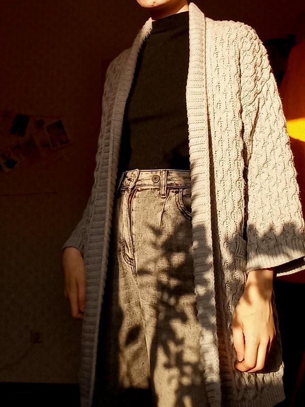 Тепленький кардиган Турція із рукавами 3/4 приємного сірого кольору, слідів носки майже немає Матеріал схожий на вовну (на етикетці 100% акрил) По плечах до 60см Рукава 36см Довжина 80см