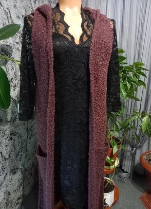 Очень красивого бордового цвета в составе шерсть,по бокам разрезы,сзади капюшон,по бокам карманы.Ог 48 см, длина 112 см
