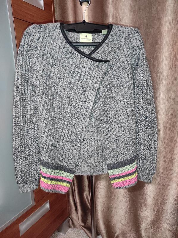 Дуже стильний кардиган в хорошому стані.Бренд SCOTCH R"BELLE AMSTERDAM.Затібається на дві кнопки.Гарно сідає по фігурі.Склад:Довжина-57 см;Напівобхват грудей-46см;Плечі-37 см.Склад:36%-акрил;30%-мохер;10%-вовна;24%-нейлон.