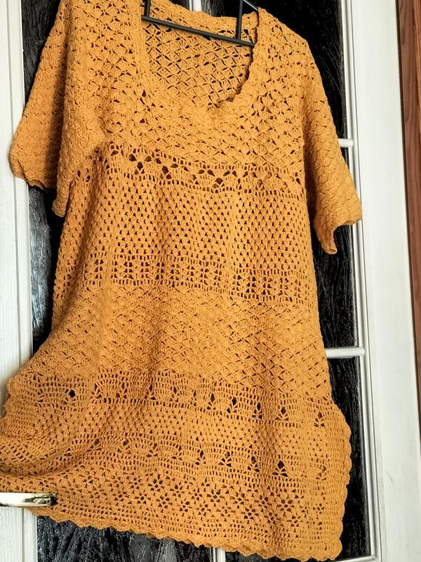 Ручна робота.Вязана туніка дуже красивого цвета .Зв'язана крючком ажурним узором из натуральної пряжи .,в единственом екземпляре .Легка и удобна в носке . Подойдет как для молодих и для пожілих .Размер 48-54.