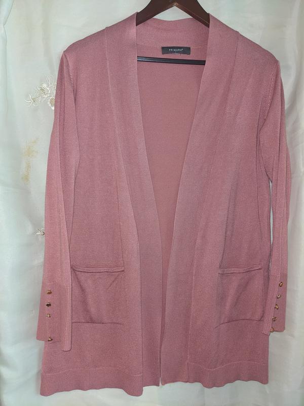 СУПЕР Кардиган розового цвета, ткань напоминает хлопок, просто бирка срезанная, бренд PRIMARK, Размер где то L.можно под джинсы, платья, юбки (Полуобхват по груди-46см ; Полуобхват по низу-52см ,;Довжена кардигана-77см;Довжена рукова-57см ,плечи. -9см) состояние очень хорошее. Очень красивого пудрового цвета.В этом кардигане будете выглядеть стильно и в тренде.