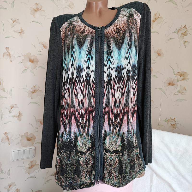 Оригінальний кардиган із тонкого трикотажу. Спереду кольоровий, на замку, в обидва боки застібається. Спинка однотонна Красивий темно-сірий благородний колір. З боків вставки сітки з мікрофібри. Приємна до тіла тканина. Не парить, не блякне на сонці. Дві функціональні кишені. Бирки зрізані. Розмір 50-54. Орієнтуйтеся на заміри. Стан ідеальний. Сліди носіння немає. Дефектів немає.