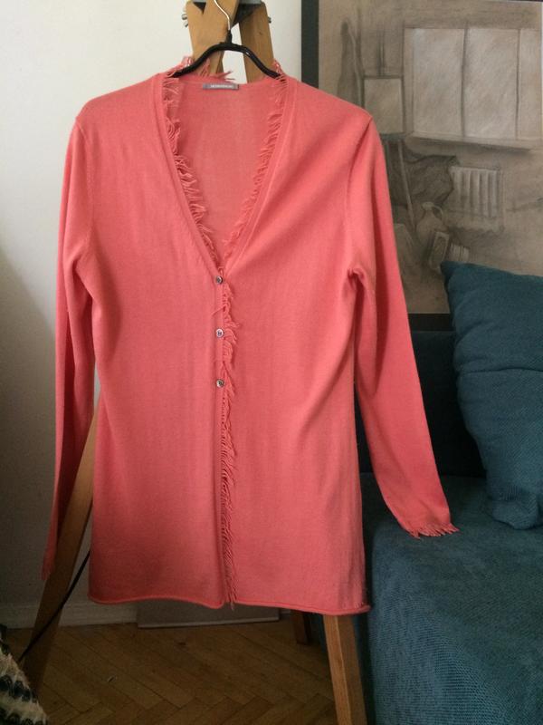 Легкая, очень приятная кофта-кардиган на трех пуговках с бахромой от роскошного премиум бренда Hemisphere, отличный состав 70% хлопок, 30% кашемир, красивый цвет, но в жизни не такой яркий, , размер М, на рост от 170см , в отличном состоянии