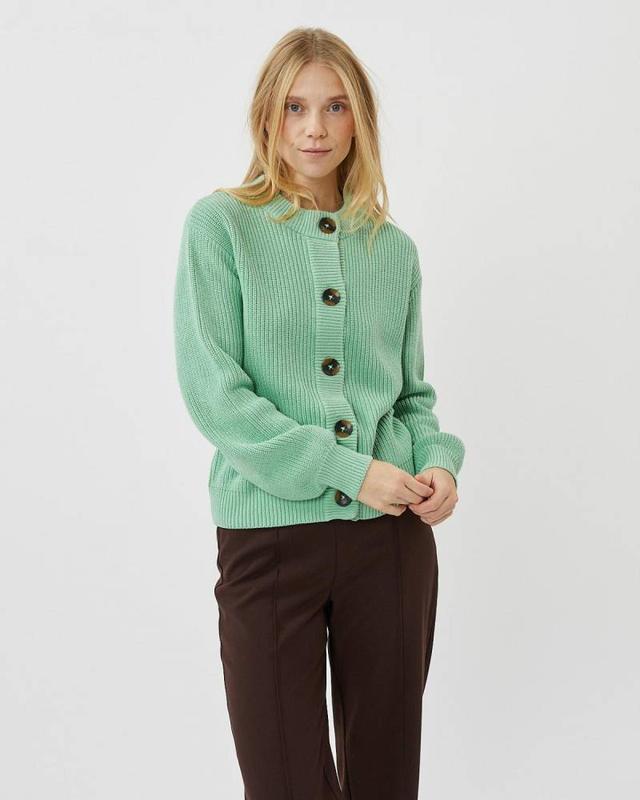 теплий в'язаний кардиган з м'якої органічної бавовни улюблений стиль, який легко надягати кардиган має структуру в рубчик 1x1 об’ємні рукави, спущені плечі, круглу горловину та великі гудзики кольори: блакитний, м'ятний, темно-синій