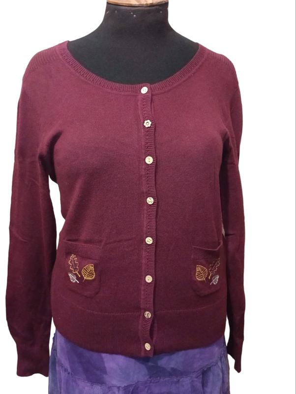 Кардиган Mantary бордового цвета, с деревянными пуговицами и вышивкой-листочками на карманах