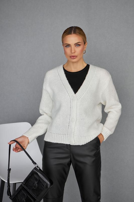 Лімітована серія із шикарної натуральної італійської пряжі. Актуальний кардиган прямого силуету виконаний з пухнастої та легкої натуральної пряжі із включенням мохера. Виріб зв'язаний у напівпрозорому та повітряному переплетенні. Низи рукавів виробу на спущеній лінії плеча оброблені щільними резинками. Кардиган з гладким краєм борту та горловини має застібку на гудзики, що додатково може фіксуватися декоративним ременем. Довжина виробу по спинці близько 56-60 см (+- 2 см), ширина під проймою 50-55 см. Склад та догляд 65% - ВОВНА МЕРИНОСА 20% - КІДМОХЕР 15% - ПОЛІАМІД Розміри: 42-46; 48-52