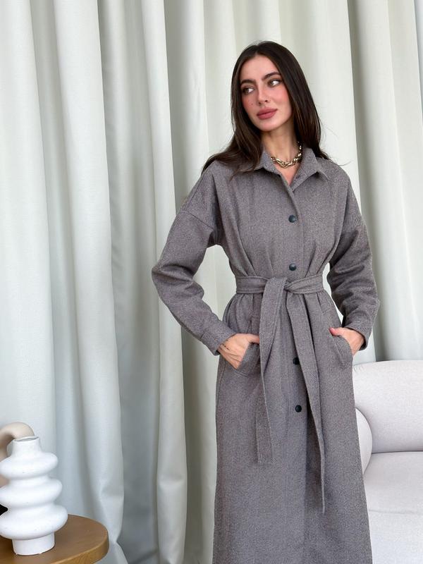 Длинный теплый кардиган в принт ёлочки удлиненная рубашка миди на кнопках с поясом лёгкое...