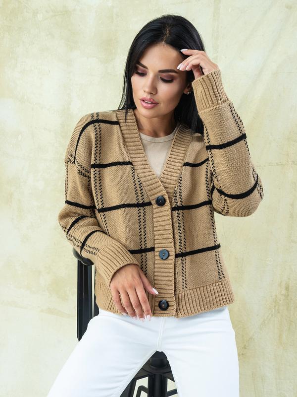 В'язаний кардиган на ґудзиках з візерунком “клітка” ▪️Розмір: 42-46 ▪️Склад: 70% акрил 30% вовна ▪️Кольори: Кемел-чорний Білий оливка Пудра-молоко Бежевий-кемель