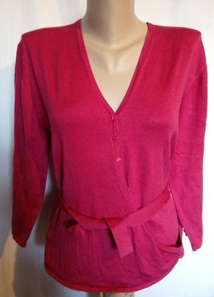 кофта ,кардиган ,чудова якість,бренд,80%натуральний шовк,ніжний трикотаж,колір як на перших двох фото,малиновий ,оригінальний крій на запах зпереду,нарядна кофта,довжина62,пог50,рукав47см,трикотаж тягнеться