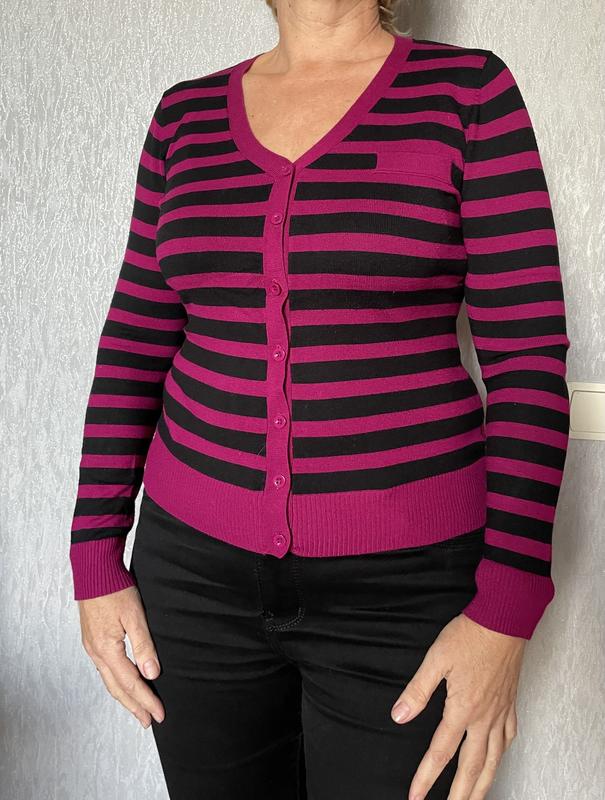 Кофта светр в полоску та на ґудзики. Біля шиї v-подібний виріз. В гарному стані, добре підійде на розмір L