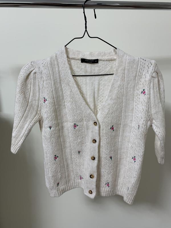 Кардиган/Кофта Цвет-Белый с розовыми цветочками Размер-ХS Единственный маленький минус-снизу срезанные бирки