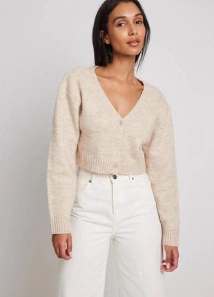 Кардиган укороченный на пуговицах с V- вырезом от Na-kd в размере S (беж меланж), S - черный Замеры: полуобхват гр. - 44 см, по низу 39 см, длина- 40-42 см, рукав - 55 см