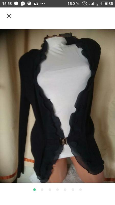 Гарна кофта темно синього кольору на розмір М - L, на ріст 165 і вище. приємна до тіла, м'яка, з нарядними оборками пліссе. Дуже добре тягнеться. Прохання перед замовленням уточняти деталі.