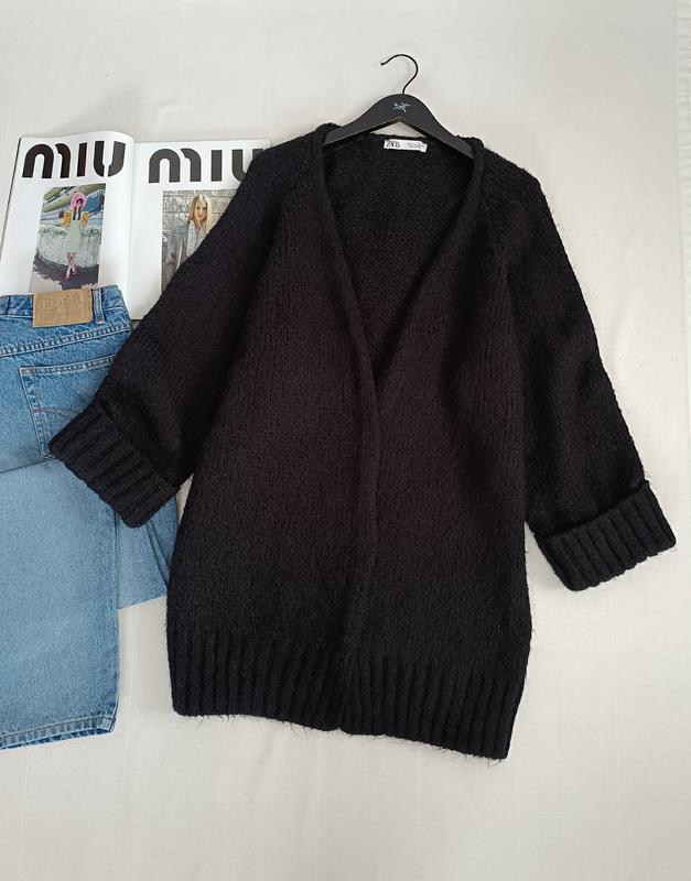 🌿 теплий чорний кардиган від Zara об'ємної в'язки без застібок Розмір:S/M Заміри:ПО грудей 60 см, довжина 88 см, рукав від горловини 70 см