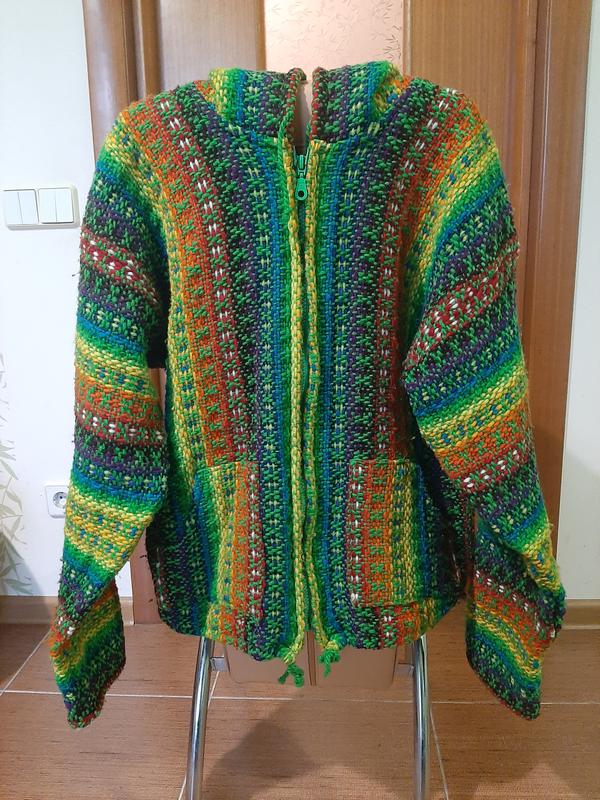 незвичайна кофта-жакет з каптуром, етно-бохо, куплена в Чилі, зроблена з натуральної вовни альпаки, плетена вручну. застібка робоча, є кишені, розмір С-М.