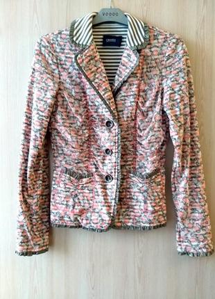 Трикотажный жакет от бренда Оrwell Selected Style. Жакет мягкий. Внутри подкладка трикотаж. Внешне очень хорошего качества сетка. Цвет нежно-розовый, с нежно-коричневым. На любой сезон. Хорошо тянется. Застегивается на ряд пуговиц. Кармашки с двух сторон. Воротник трикотажный. Рукав стандартной длины, можно подогнуть, тогда получается трикотажный манжет в полоску. По всему пиджачку края выполнены атласной лентой. Создавая при этом романтичный образ. ПОГ 40 см / ПОТ 36 см / ПОБ 38 см Длина - 55 см, Длина рукава - 60 см, Плече 10 см Ширина по плечах 38 см Состав: Хлопок / Эластан / Полиэстер Качество отличное. Эксклюзивная вещь, не массового производства. Идеальная посадка за счет трикотажной стрейч ткани. Выглядит очень презентабельно дорого. За счет сетки выглядит необычно. Причина продажи - не подходит по размеру.