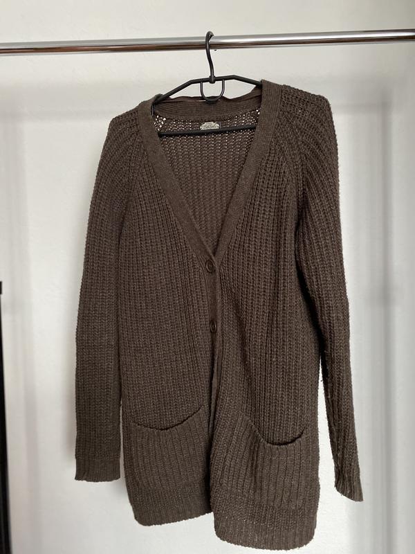 Темно-коричневый вязаный кардиган с карманами. Длина 76 см, такая же длина рукава. Размер М.