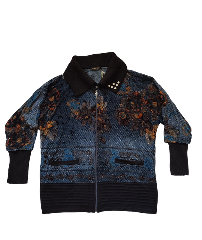 Кофта Darkwin с восточным принтом. Застежка молния и воротник отделаны стразами. Есть два кармана. Размер:"L" Длина: 66 см. Рукав от воротника:64 см. Пог: 58 см Стан новая вещь.