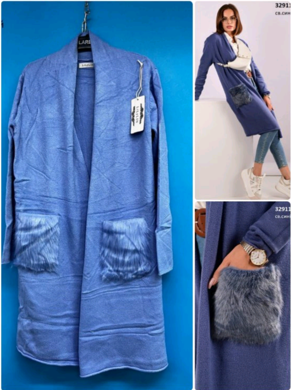 Кардиган блакитного кольору. Трикотаж + ангора. 42% віскоза, 30%поліамід, 28%modal. Розмір L-XL