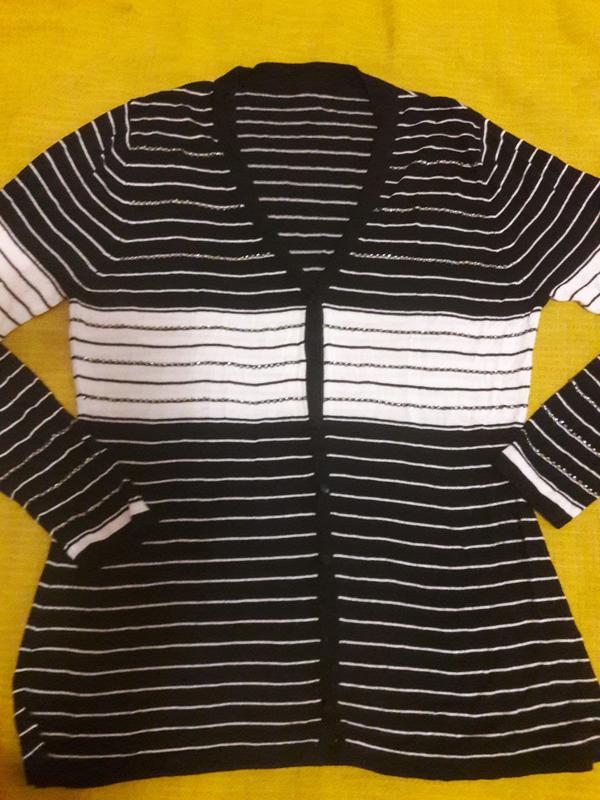 Кофта,колір чорно-біла смуг ка + бісер.Дуже приємний м'я кий трикотаж.Виглядає стиль але і симпатично.Довжина 67см, плечі 37см,груди 47см,низ 49 см,рукав 62cm.Смужки віз де збігаються з малюнку в бік. швах і навіть на проймі,що зна чит гарна якість.Внизу невеликі розрізи.Вказаний розмір М. Якщо треба ще фото - дошлю. ДЕФЕКТ: відсутні 2 гудзики. Можна підібрати і пустити через одну 2 види як зараз роблять. Доставка УП, НП або Джастін
