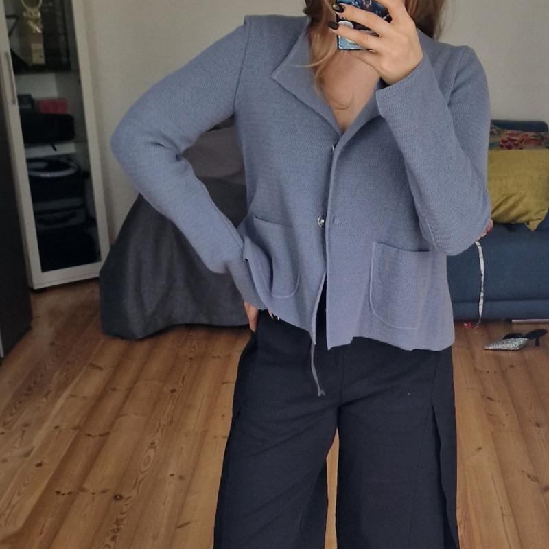 Кардиган дуже стильовий , графітово небесного кольору, купувала за 200 євро в Італії. Його можна комбінувати з чим завгодно. І носити на светр навіть восени як теплий піджак.