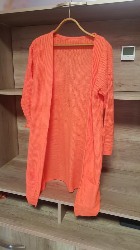 Кардіган поманранчевого неонового кольору. В ньому непомітною неможливо бути)) розмір с-м. довжина виробу 93 см