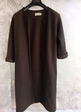 Теплый кардиган.р.S.рукав 3/4 цельнокоричневый.карман. длина 100.талия 46.темно-зеленого цвета.