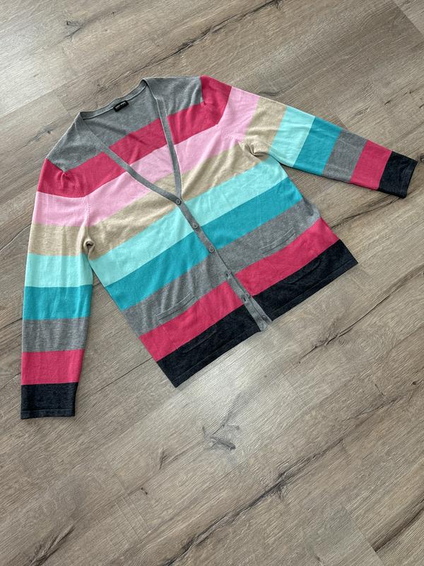 Красивий кардиган ніжні кольори новий , тканина тонка ніжна на дотик, можна носити на голе тіло. Є запасний ґудзик, заміри нОг 54 довжина 68 рукав 60 см, склад на фото, сток