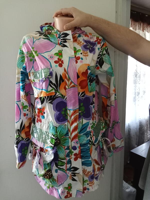 Хлопковая 100% парка красивой яркой расцветки с карманами в пайетки, внутри стягивается шнуром, капюшон, на карманах симпатичные банты, на 50 52 размер, длина 80, рукав 60, пог 57,идеальна
