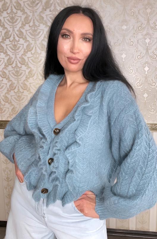 Тепленький , мʼякенький, розкішний кардиган від зара Обʼємні рукава з ажурними манжетами, глибокий блакитний з додаванням легкої бірюзи колір( камера не передає правильний) Розмір Л Склад :44% альпака, 30% нейлон, 17% вовна, 9% віскоза Довжина.виробу 52см Довжина рукава. 50см (враховуйте спущене плече) Ширина до 65см