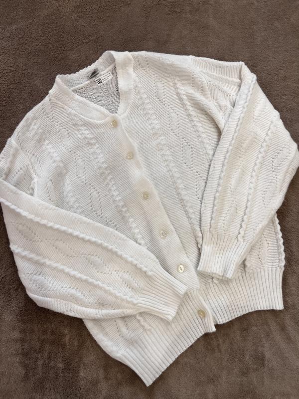 Кардиган вінтажний вʼязаний білого кольору 📍Розмір -40/42( L/XL) 📍Довжина- 58 📍Пог- 53 📍Плечі -45 📍Рукав -54