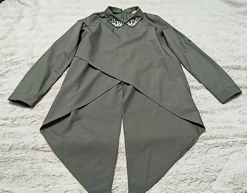 Стильная кофта со стразами на воротнике цвета хаки с удлиненным задом