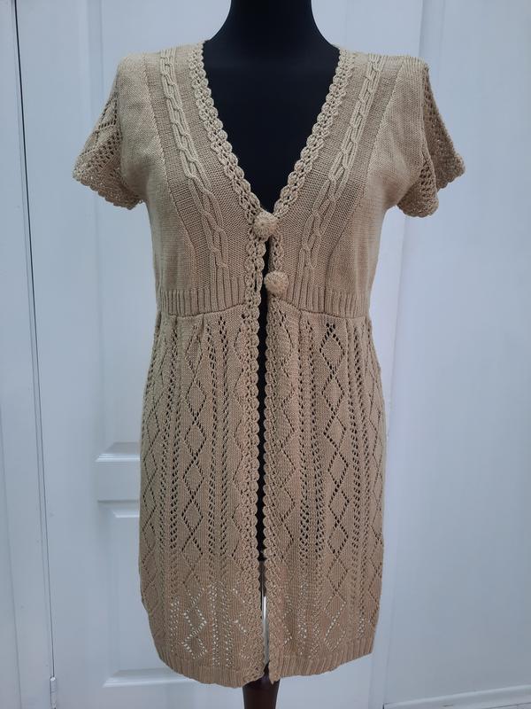 кардиган приємного кольору ,ажурна вязка -доповнить гарний образ.Річ нова полуобхват груди- 44см полуобхват бедер 46см довжина 80 см