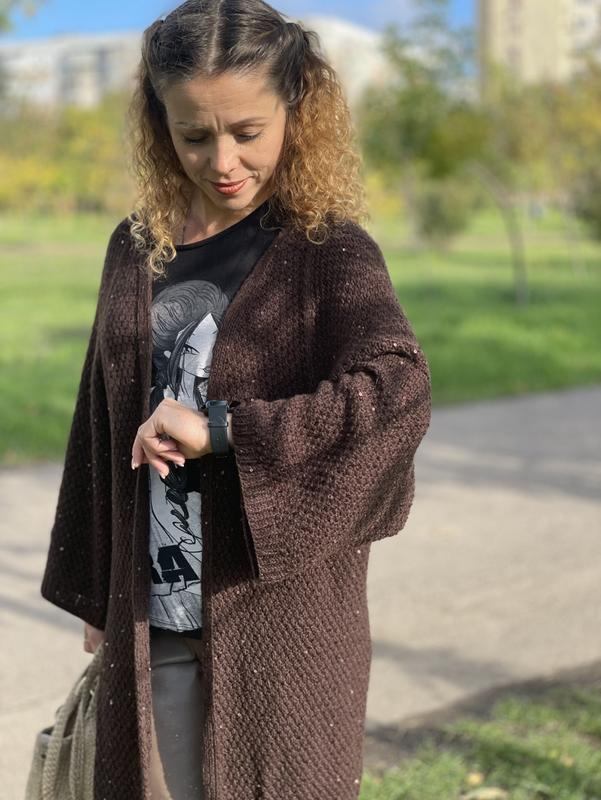 Кардиган ручной вязки, конструкция реглан-погон сверху. Связано одной деталью, без швов. Состав 100% шерсть (австралийское сырье) с добавлением пайетки 3 мм на коттоне. Цвет - шоколад, на солнце красиво поблескивают пайетки. Подойдет на размер XS/S Ширина изделия - 55 см Длина - 83 см