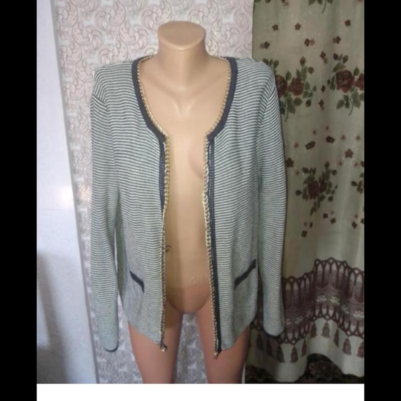 Гарний кардиган у біло-синю смужку.Кармани-обманки, застібається зверху на гачок.По контуру декорований ланцюжком під золото. Склад: 100% котон. Стан дуже гарний. Розмір вказаний М. Підійде на 48-50 розмір. Орієнтуйтеся на заміри. Заміри: ПОГ-49 см;НОТ-49 см; поніза-52 см; плечі — 46 см;рукав — 61 см; довжина — 80 см. Світлина на тілі немає. Пересилання.