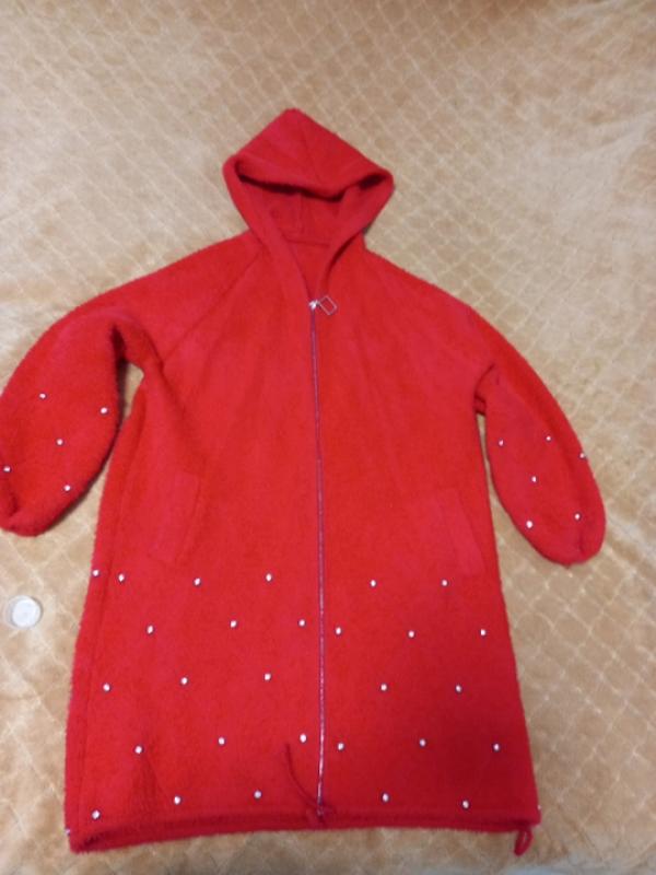 Добре тягнеться. Дуже тепла. Можна носити до 56р.Дві робочих кишені,Зав'язка по низу. Капішон. Колір ярко червоний. Вибачте, але не передає камера.