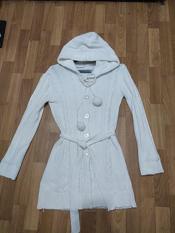Біла кофта довга з капюшоном та балабонами на гудзиках з поясом вьязана тепла, 70% вовна. Виробник Туреччина ПОГ 48-55, ПОТ 45-52, довжина по центру спинки без капюшона 78-83, рукава 62-64 ( можна відвернути), плечі 46-51 Кофта плетена / вьязана, тому заміри приблизні, тягнеться