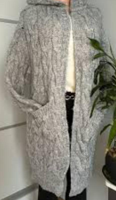 Кардеган крупної в'язки. Теплий з капюшоном, без кріплення тобто без ґудзиків та поясу. В Складі шерсть та акрил. Ніжно сірого кольору. Повний 44. Але гарно і на 42. Можна прати в машинці. Перше фото із інтернета, дуже схожа модель, але без кишень. Виробник Турція.