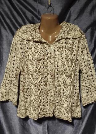 Классическая кофта фасона оверсайз с рукавами 3/4 . В этом красивом изделии все детали имеют одну отличительную черту – размер. Крупная вязка, массивные пуговицы, широкие отворот воротника и сам фасон изделия составляют одно гармоничное целое. Эта оригинальная модель идеально сочетается с узкими брюками или джинсами. Конечно, цвет ее сложно назвать практичным, но красота, как известно, требует жертв. Наденьте под эту шикарную кофту гольф или подходящую майку и оригинальный образ готов. Размер 16. Замеры: длина - 60см,плечи - 42см, рукав - 45см, ПОГ - 53см,ПОТ - 54см, ПОБ - 60см