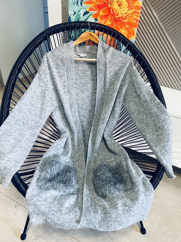 Тепла об’ємна кофта-кардиган з хутровими карманами у сірому кольорі. Дуже ефектно сідає по фігурці. Можно носити з поясом. Розмір XS/S, підійде і на М