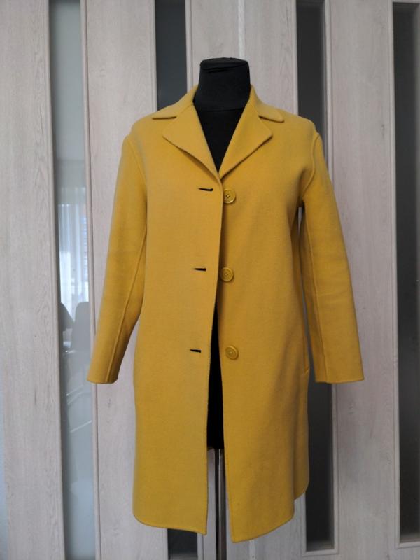 кашеміровий кардіган, яскравого жовтого кольору, з кишенями, без підкладки, рукави на підкладці защипається на гудзики.